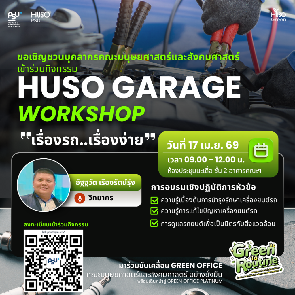 คณะมนุษยศาสตร์และสังคมศาสตร์ มหาวิทยาลัยสงขลานครินทร์ วิทยาเขตปัตตานี จัดกิจกรรมอบรมเชิงปฏิบัติการ “HUSO GARAGE WORKSHOP เรื่องรถ…เรื่องง่าย” เมื่อวันที่ 17 เมษายน 2569 ณ ห้องประชุมมะเดื่อ ชั้น 2 อาคารคณะมนุษยศาสตร์และสังคมศาสตร์