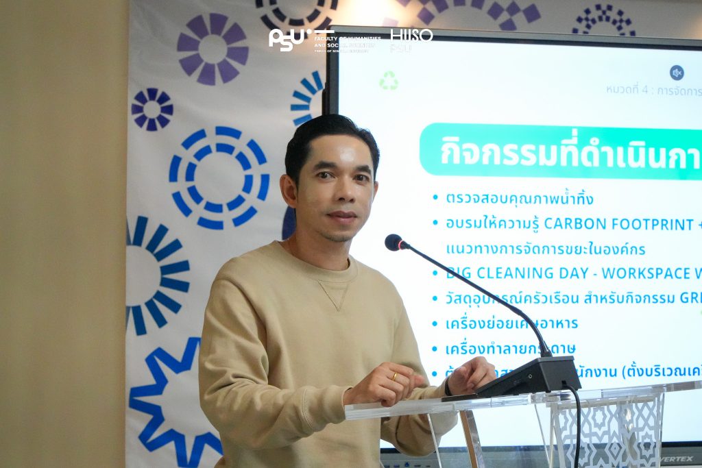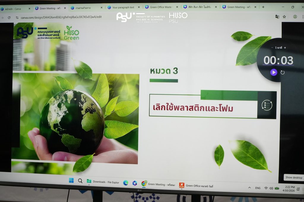 คณะมนุษยศาสตร์และสังคมศาสตร์ มหาวิทยาลัยสงขลานครินทร์ วิทยาเขตปัตตานี จัดการอบรมในหัวข้อ “Green Meeting: การประชุมที่เป็นมิตรกับสิ่งแวดล้อม” เมื่อวันที่ 10 เมษายน 2569 เพื่อซักซ้อมแนวทางการดำเนินงานให้แก่บุคลากรสายอำนวยการ โดยมุ่งเน้นการปรับรูปแบบการประชุมให้ลดผลกระทบต่อสิ่งแวดล้อม ควบคู่กับการสร้างจิตสำนึกในการใช้ทรัพยากรอย่างคุ้มค่า และเสริมสร้างความรู้ด้านการจัดซื้อจัดจ้างที่เป็นมิตรต่อสิ่งแวดล้อม (Green Procurement)