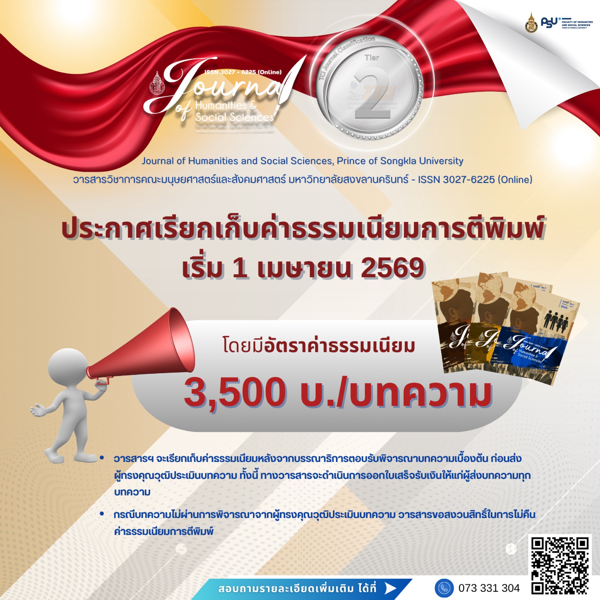 - Journal of Humanities and Social Sciences, Prince of Songkla University (วารสารวิชาการคณะมนุษยศาสตร์และสังคมศาสตร์ มหาวิทยาลัยสงขลานครินทร์) ประกาศ เรียกเก็บค่าธรรมเนียมการตีพิมพ์บทความ จำนวน 3,500 บาทต่อบทความ 📅 [ เริ่ม 1 เมษายน 2569 ]