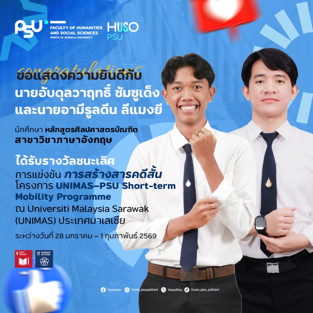 นักศึกษาหลักสูตรศิลปศาสตรบัณฑิต สาขาวิชาภาษาอังกฤษ คณะมนุษยศาสตร์และสังคมศาสตร์ มหาวิทยาลัยสงขลานครินทร์ วิทยาเขตปัตตานี สร้างผลงานโดดเด่นในเวทีระดับนานาชาติ ภายใต้โครงการ UNIMAS–PSU Short-term Mobility Programme ณ Universiti Malaysia Sarawak (UNIMAS) ประเทศมาเลเซีย ระหว่างวันที่ 28 มกราคม – 1 กุมภาพันธ์ 2569