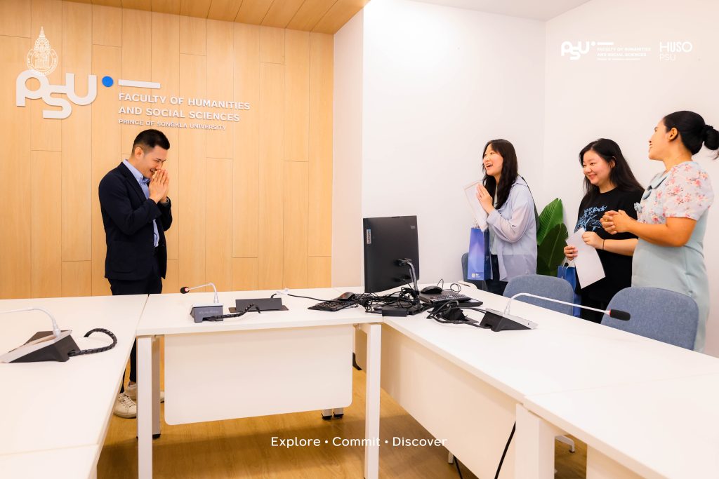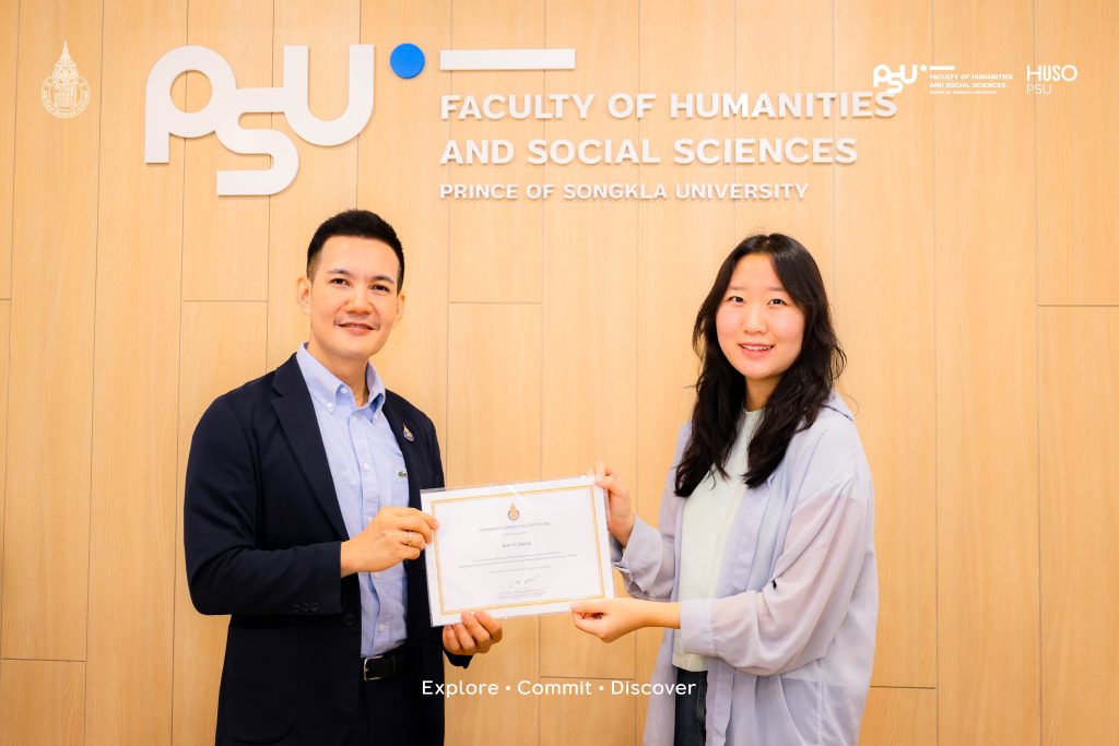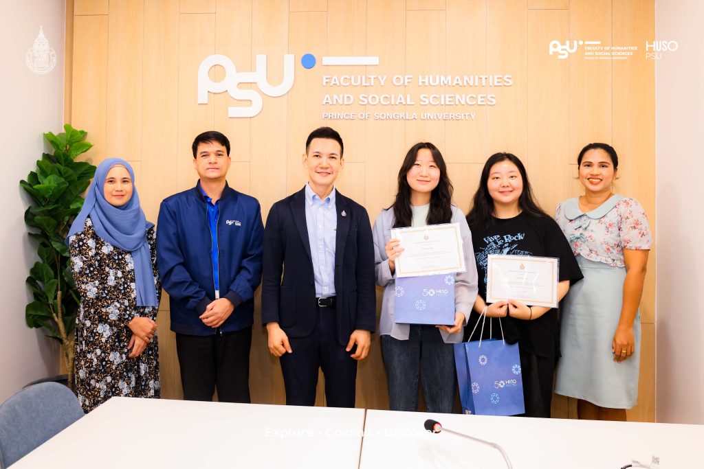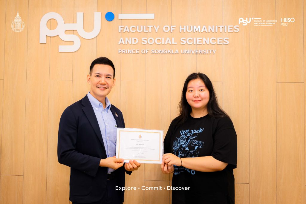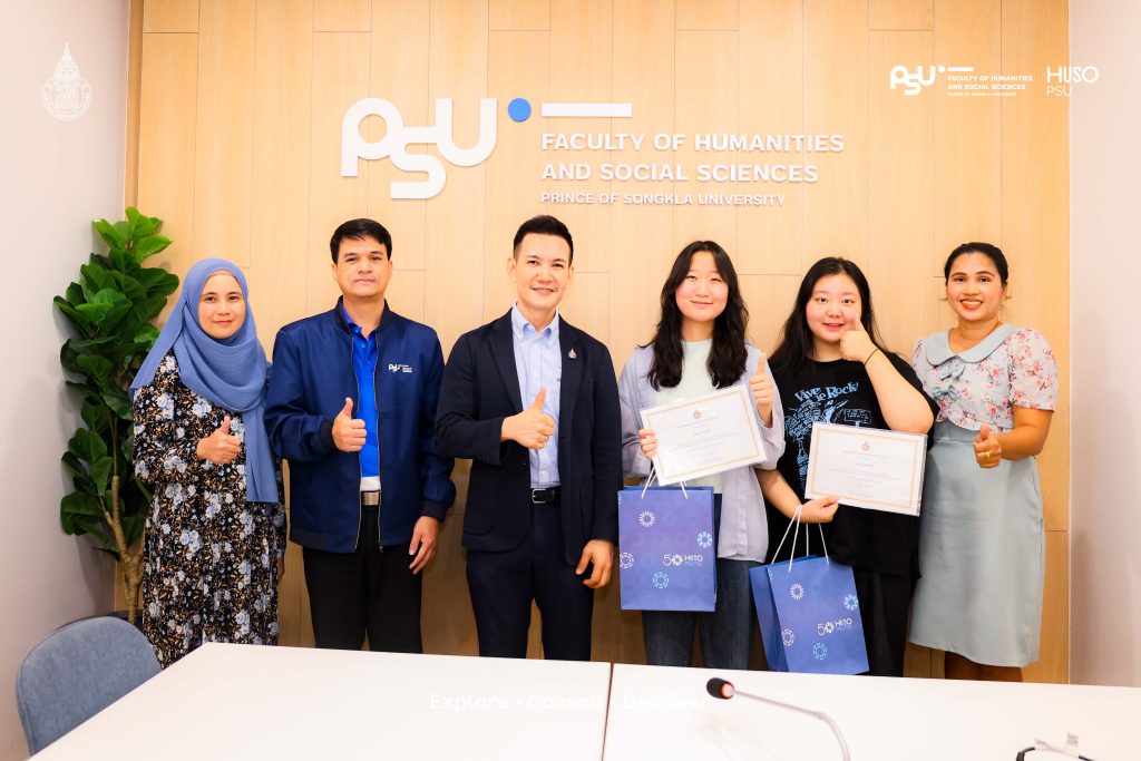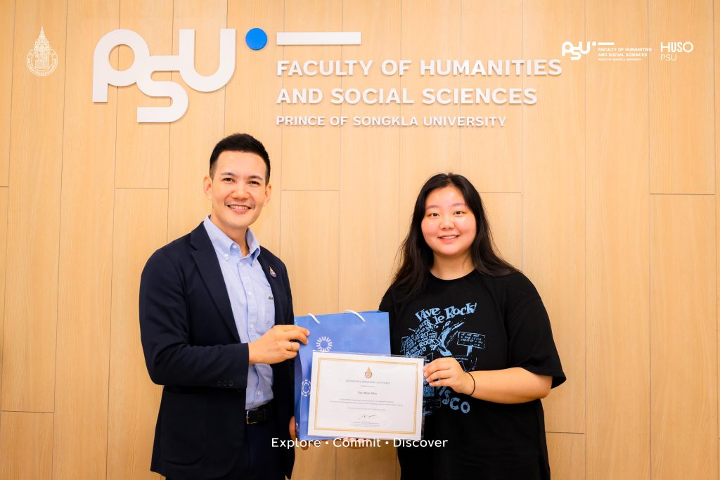 ในการนี้ ทางคณะฯ จัดพิธีมอบเกียรติบัตรเพื่อแสดงความขอบคุณและเป็นหลักฐานยืนยันการสิ้นสุดการฝึกประสบการณ์ แก่นักศึกษาทั้งสอง โดยได้รับเกียรติจากผู้ช่วยศาสตราจารย์ ดร.เชิดชัย อุดมพันธ์ คณบดี พร้อมด้วย อาจารย์สุรเดช ทองบุญชู ผู้ช่วยคณบดีงานวิรัชกิจและสื่อสารองค์กร ร่วมมอบเกียรติบัตร เมื่อวันศุกร์ ที่ 22 สิงหาคม 2568 ที่ผ่านมา ณ ห้องมะยม ชั้น 2 อาคารคณะมนุษยศาสตร์และสังคมศาสตร์ มหาวิทยาลัยสงขลานครินทร์ วิทยาเขตปัตตานี