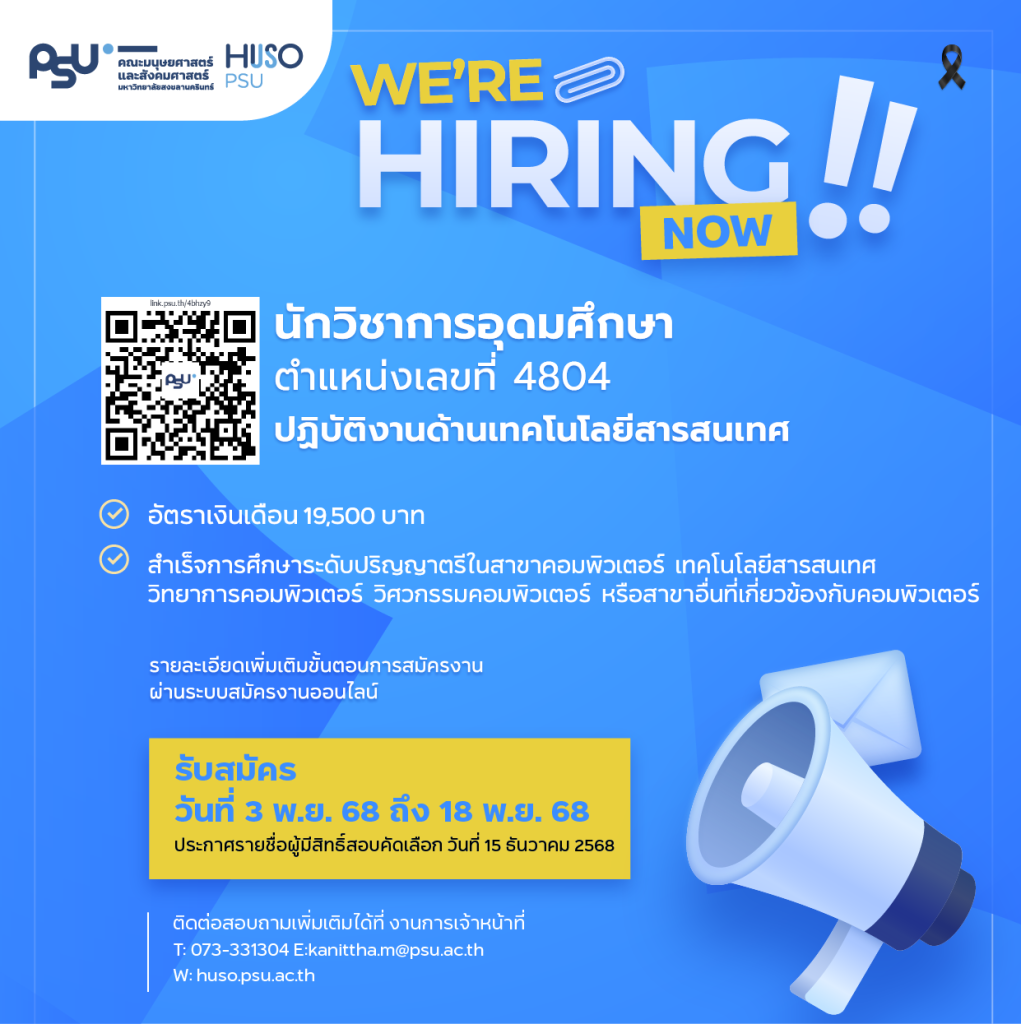 คณะมนุษยศาสตร์และสังคมศาสตร์ มหาวิทยาลัยสงขลานครินทร์ เปิดรับสมัครนักวิชาการอุดมศึกษา 2 อัตรา