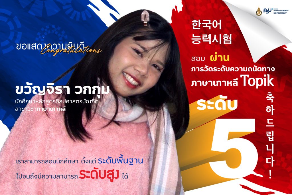 🎉🎉🎉 ขอแสดงความยินดี กับ :: [ ” นางสาวขวัญจิรา วกกุม ” ] :: นักศึกษาหลักสูตรศิลปศาสตรบัณฑิต สาขาวิชา #ภาษาเกาหลี 🔵⚪ ที่ ” #สอบผ่าน ” การวัดระดับความถนัดทางภาษาเกาหลี #TOPIK [ ระดับ 5 ] 🇰🇷🇰🇷🇰🇷🇰🇷🇰🇷