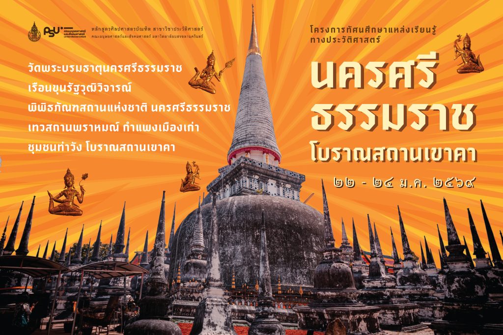 หลักสูตรศิลปศาสตรบัณฑิต สาขาวิชาประวัติศาสตร์ คณะมนุษยศาสตร์และสังคมศาสตร์ มหาวิทยาลัยสงขลานครินทร์ นำนักศึกษาออกเดินทางมุ่งสู่จังหวัดนครศรีธรรมราช ดินแดนแห่งอารยธรรมศรีวิชัย ในโครงการทัศนศึกษาแหล่งเรียนรู้ทางประวัติศาสตร์และโบราณคดี เมื่อวันที่ 22 – 24 มกราคม 2569 ที่ผ่านมา การเดินทางครั้งนี้ เป็นการบูรณาการเรียนในรายวิชา 425-344 โบราณคดีปฏิบัติการ ( Archaeological Practice ) โดยมีวัตถุประสงค์หลักเพื่อให้นักศึกษาได้สัมผัสและสังเกตหลักฐานทางประวัติศาสตร์ของจริงในพื้นที่จังหวัดนครศรีธรรมราช ซึ่งเป็นศูนย์กลางความเจริญของคาบสมุทรภาคใต้และเมืองท่าสำคัญในอดีต การลงพื้นที่ครั้งนี้ช่วยให้นักศึกษาฝึกทักษะการวิเคราะห์และตีความตามระเบียบวิธีวิจัยทางโบราณคดี เชื่อมโยงความรู้จากเอกสารและตำนานเข้ากับสภาพแวดล้อมทางกายภาพจริง พร้อมทั้งปลูกฝังจิตสำนึกในการอนุรักษ์มรดกทางวัฒนธรรมของชาติ