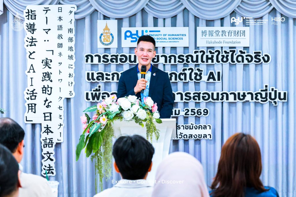 คณะมนุษยศาสตร์และสังคมศาสตร์ มหาวิทยาลัยสงขลานครินทร์ จัดงานสัมมนาเครือข่ายครูสอนภาษาญี่ปุ่นในเขตภาคใต้ หัวข้อ ” การสอนไวยากรณ์ให้ใช้ได้จริง และการประยุกต์ใช้ AI เพื่อการเรียนการสอนภาษาญี่ปุ่น ” เนื่อในโอกาสครบรอบ 40 ปี แห่งการเรียนการสอนภาษาญี่ปุ่น คณะมนุษยศาสตร์และสังคมศาสตร์ มหาวิทยาลัยสงขลานครินทร์ ณ โรงแรมโซลิส บีช ราชมังคลา จังหวัดสงขลา ระหว่างวันที่ 7 – 8 มีนาคม 2569 ที่ผ่านมา เพื่ออัปเกรดทักษะวิชาชีพครูระดับมัธยมศึกษาในภาคใต้จำนวน 25 ท่าน ให้สามารถนำเทคโนโลยี AI มาช่วยจัดการเรียนการสอนได้อย่างมีประสิทธิภาพและตอบโจทย์เด็กยุคใหม่ ซึ่งงานนี้ได้รับเกียรติจาก ผู้ช่วยศาสตราจารย์ ดร.เชิดชัย อุดมพันธ์ คณบดีคณะมนุษยศาสตร์และสังคมศาสตร์ เป็นประธานในพิธีเปิด