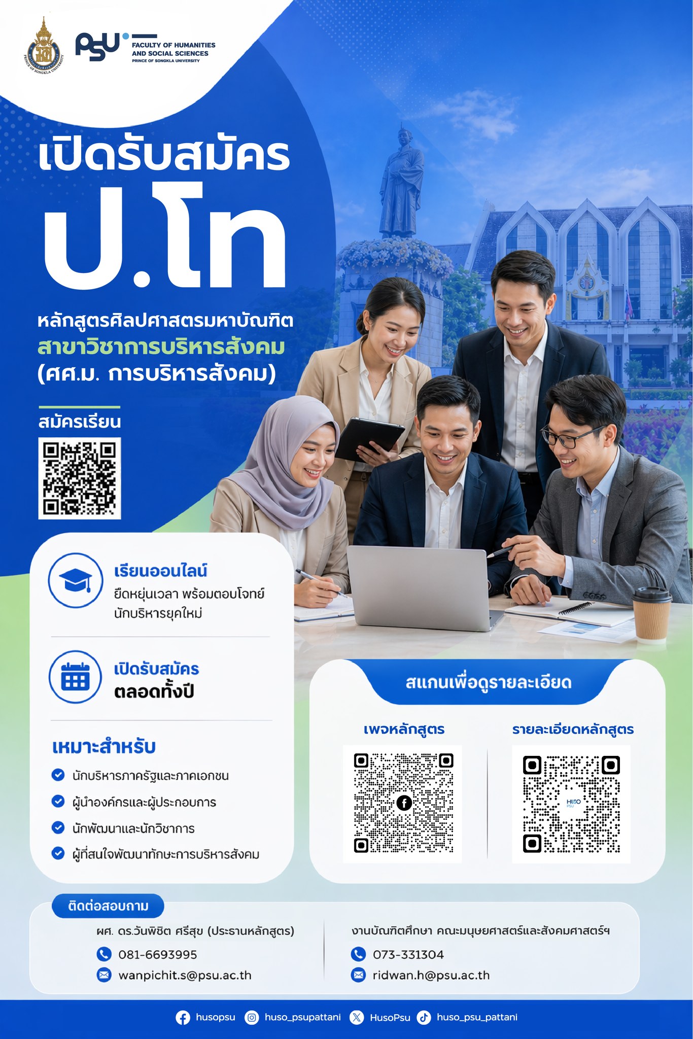 สมัครเรียน บัณฑิตวิทยาลัย ระบบสารสนเทศบัณฑิต (GSMS) หลักสูตรระดับปริญญาโท 2 หลักสูตร 1. ศิลปศาสตรมหาบัณฑิต สาขาวิชาภาษาไทย รายละเอียดและโครงสร้างหลักสูตรศิลปศาสตรมหาบัณฑิต สาขาวิชาภาษาไทยสอบถามเพิ่มเติม : Facebook หลักสูตรบัณฑิตศึกษา สาขาวิชาภาษาไทย มหาวิทยาลัยสงขลานครินทร์ ปัตตานี 2. ศิลปศาสตรมหาบัณฑิต สาขาวิชาการบริหารสังคม รายละเอียดและโครงสร้างศิลปศาสตรมหาบัณฑิต สาขาวิชาการบริหารสังคมสอบถามเพิ่มเติม : Facebook หลักสูตรปริญญาโท สาขาวิชาการบริหารสังคม มหาวิทยาลัยสงขลานครินทร์ ผู้เข้าชม: 1,372